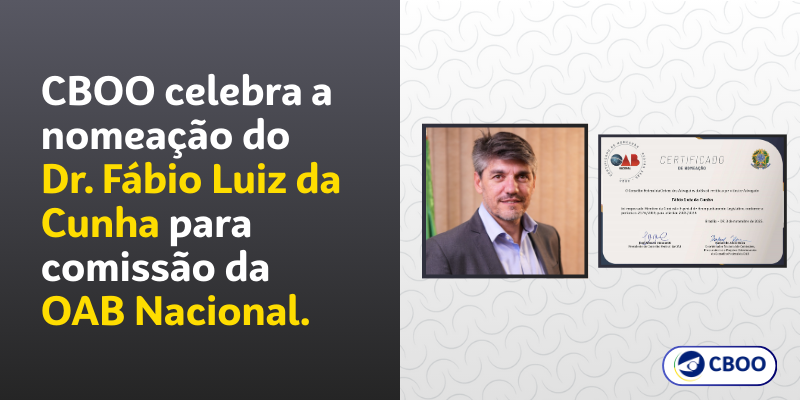 A CBOO tem a honra de anunciar a nomeação de seu Procurador Jurídico, Dr. Fábio Luiz da Cunha, para integrar a Comissão Especial de Acompanhamento Legislativo do Conselho Federal da Ordem dos Advogados do Brasil (OAB).